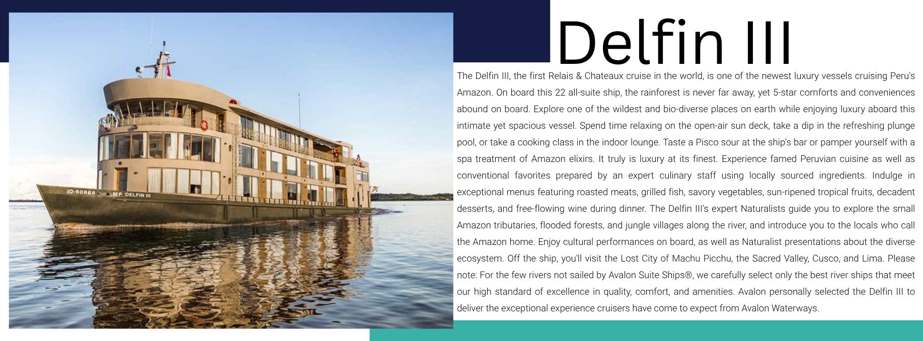 Later tonight, enjoy Live Entertainment by the Delfin III crew of local performers to celebrate your Amazon adventure with music and dance.
