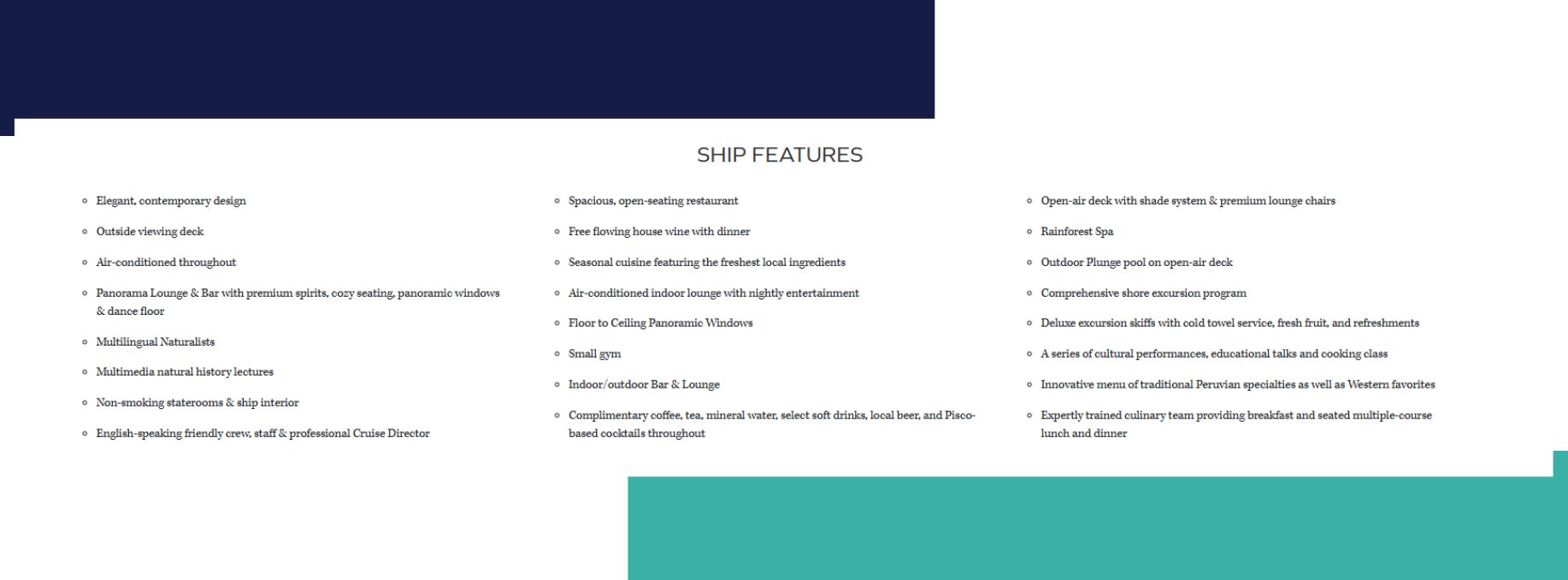 Join in an onboard Cooking Class to learn about native fruits, vegetables, and fish. You’ll learn about local ingredients for delicious recipes. In the evening, enjoy a Mixology Lesson to create Peru’s famous cocktail, the Pisco Sour.